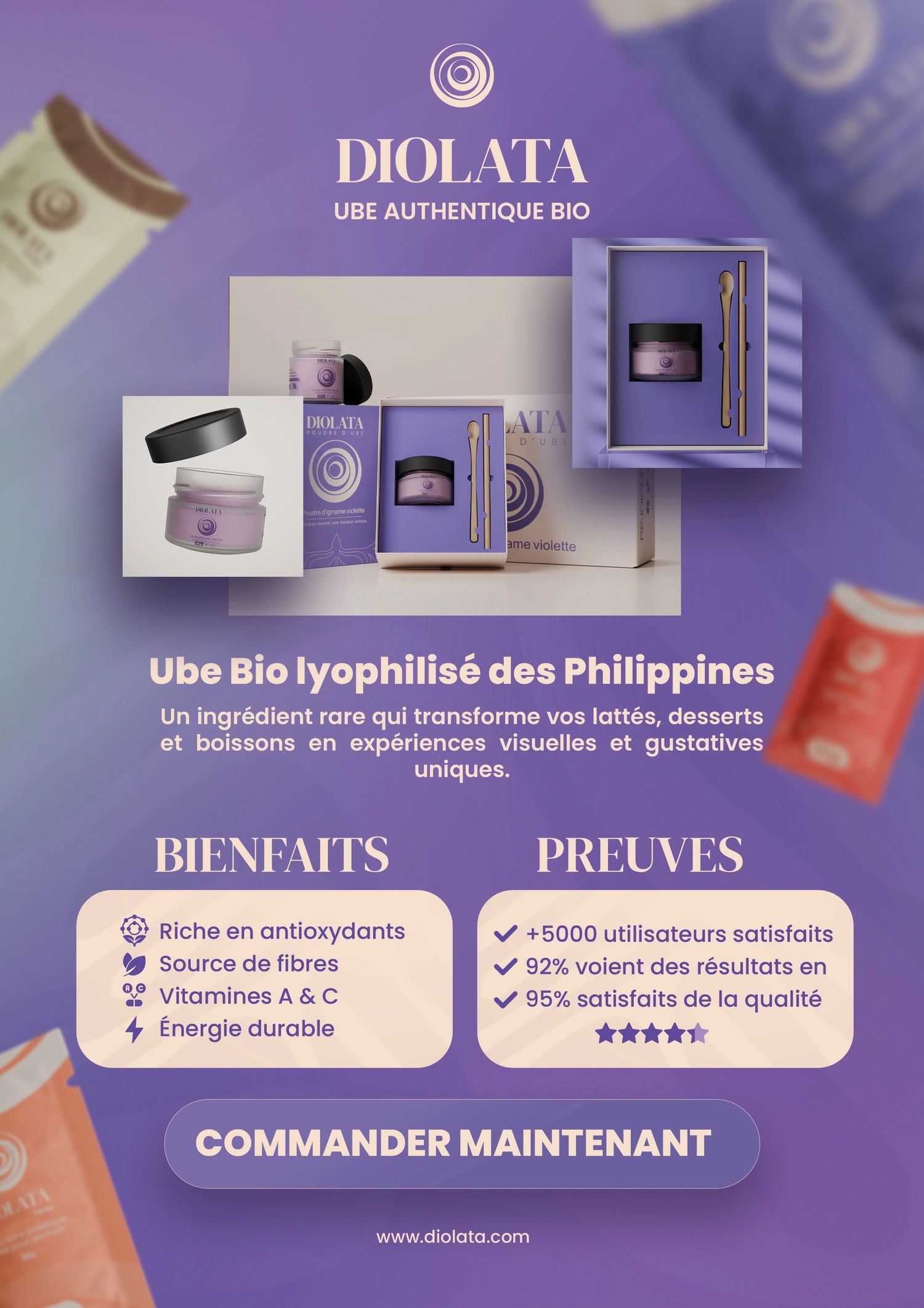 Nous offrons une véritable expérience premium, sans compromis. De la sélection rigoureuse des racines d'ube les plus éclatantes à notre packaging élégant et protecteur, chaque détail est pensé pour la qualité. Nous privilégions l'intégrité biologique, l'excellence esthétique et un produit transparent ("clean-label") afin que vous sachiez exactement ce que vous consommez.